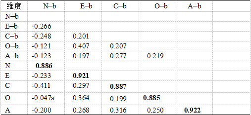 注:E-b,C-b,O-b,A-b,N-b表示简式版各维度的简称;除a无显著相关外,其它系数均在0.01的水平上显著。