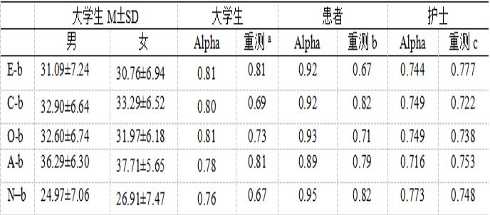 CBF–PI–B各因子与NEO–PI–R对应因子间的相关为:宜人性0.358,外向性0.761,开放性0.660,神经质0.736和严谨性0.846,均达到统计学显著水平。