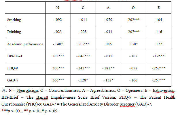在胰腺癌患者群体,神经质因子与贝克焦虑量表和流调中心用抑郁量表的相关系数分别为:0.52和0.50,p<0.01[7]。在护士群体,神经质因子与抑郁焦虑压力中文精简版三个因子间的相关分别为:抑郁分量表0.53,焦虑分量,0.524,压力分量表0.593。上述效标测量与其它四个因子间的相关系数(绝对值)多在0.1至0.2之间[6]。