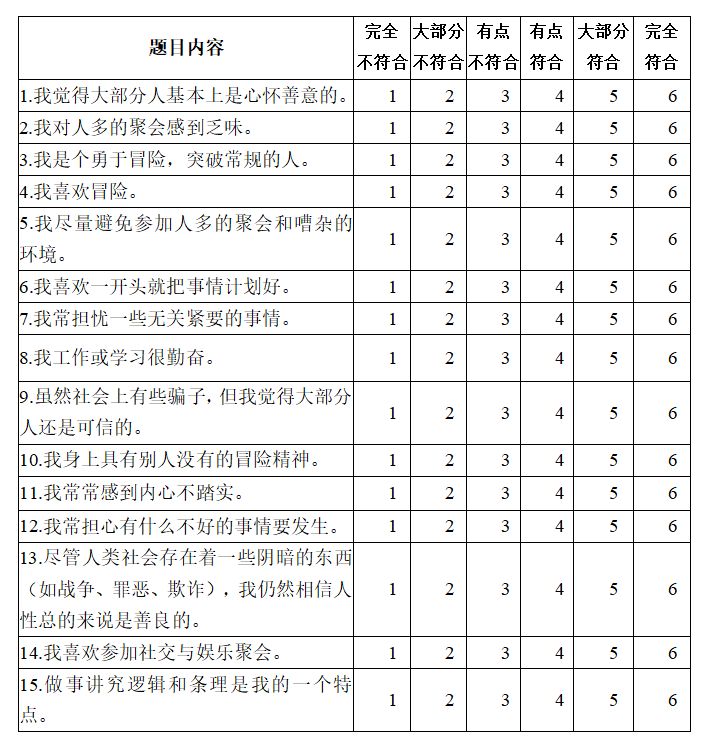指导语:下面是一些描述人们性格特点的句子,请根据每个句子与您的性格相符程度在相应的数字上画○,其中“1”=“完全不符合”,“2”=“大部分不符合”,“3”=“有点不符合”,“4”=“有点符合”,“5”=“大部分符合”,“6”=“完全符合”。