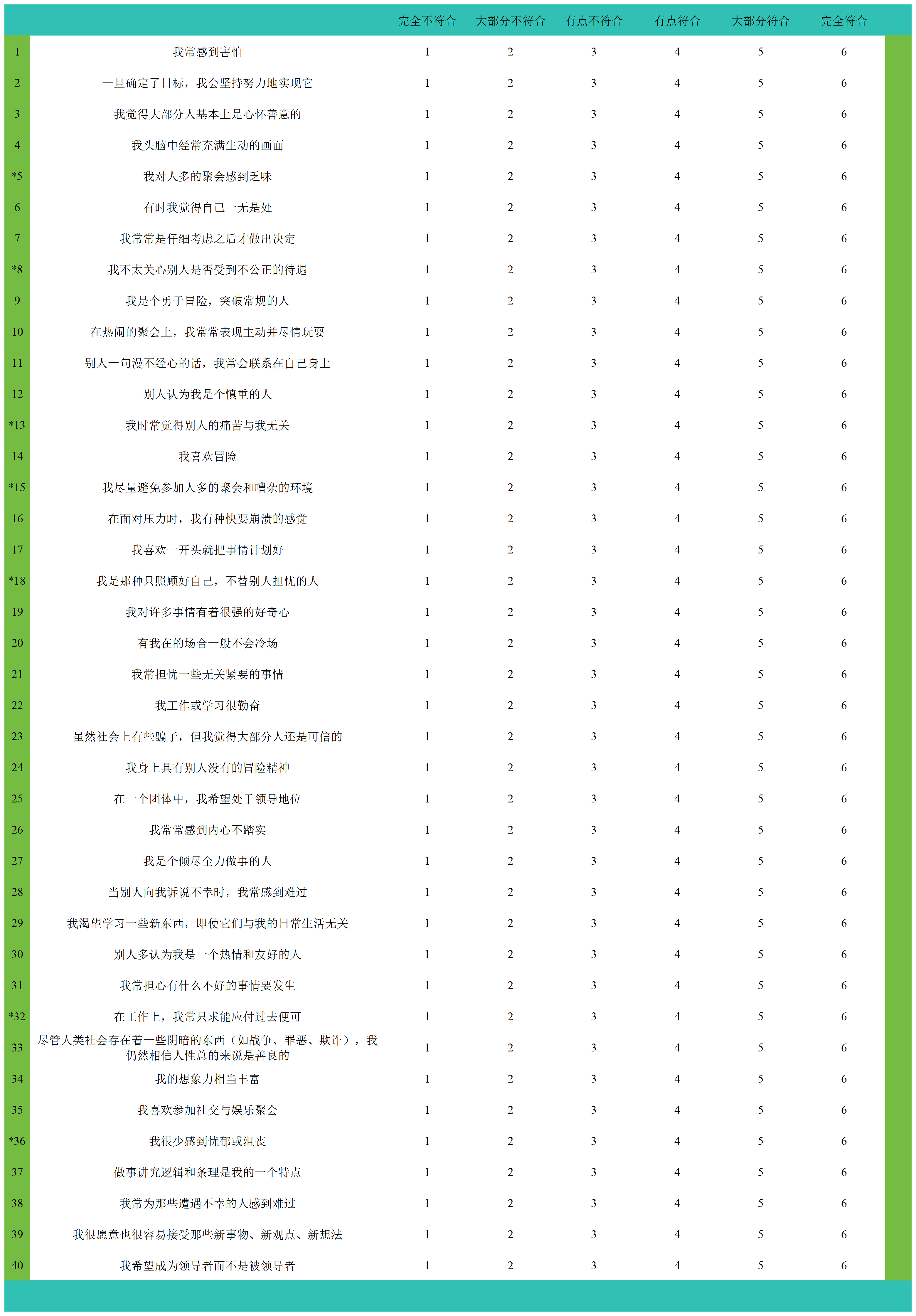 例如:“在集体活动中,我是个活跃分子”非常恰当的描述您,那么请您在“6=完全同意”上画圈,依此类推。每个人的性格各不相同,所以答案没有对错之分,请根据您的实际情况作答。