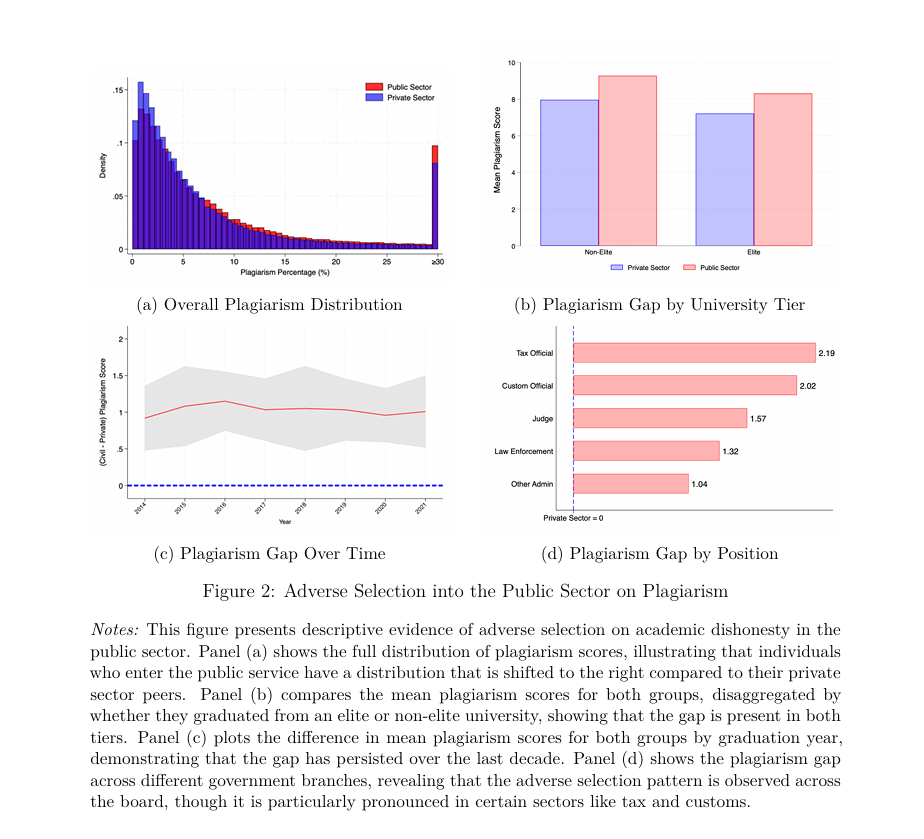 偏爱“铁饭碗”:与进入企业或私营部门的同学相比,论文抄袭分数高的人,显著更倾向于报考并成功进入政府机关、司法系统等公共部门。