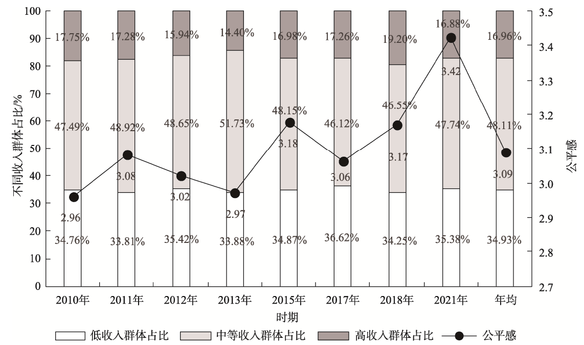 图2 不同收入群体占比与公平感的时期变化(2010~2021年)