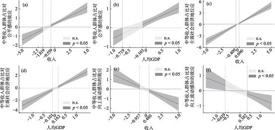 注:图a和b表示随着收入或人均GDP的提高, 中等收入群体占比对公平感的效应从显著负向变为显著正向; 图c和d表示随着收入或人均GDP的提高, 中等收入群体占比对主观社会经济地位的效应从显著负向变为显著正向; 图e和f表示随着收入或人均GDP的提高, 中等收入群体占比对向上流动感知的效应从显著正向变为显著负向。