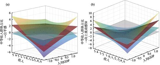 注:红色网格面代表中等收入群体占比对公平感的效应, 上方橙色面代表95%置信区间的上限, 下方蓝色面代表95%置信区间的下限, 灰色面代表效应值为0的空间位置。彩图见电子版。
