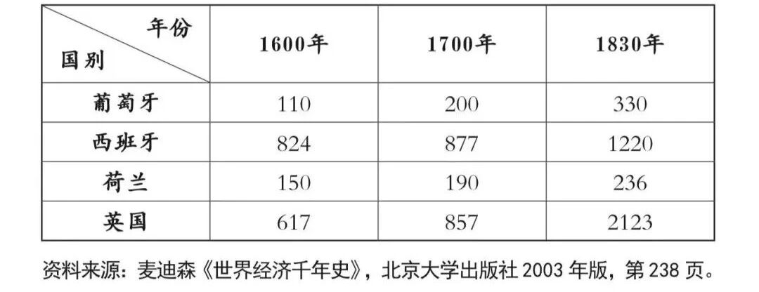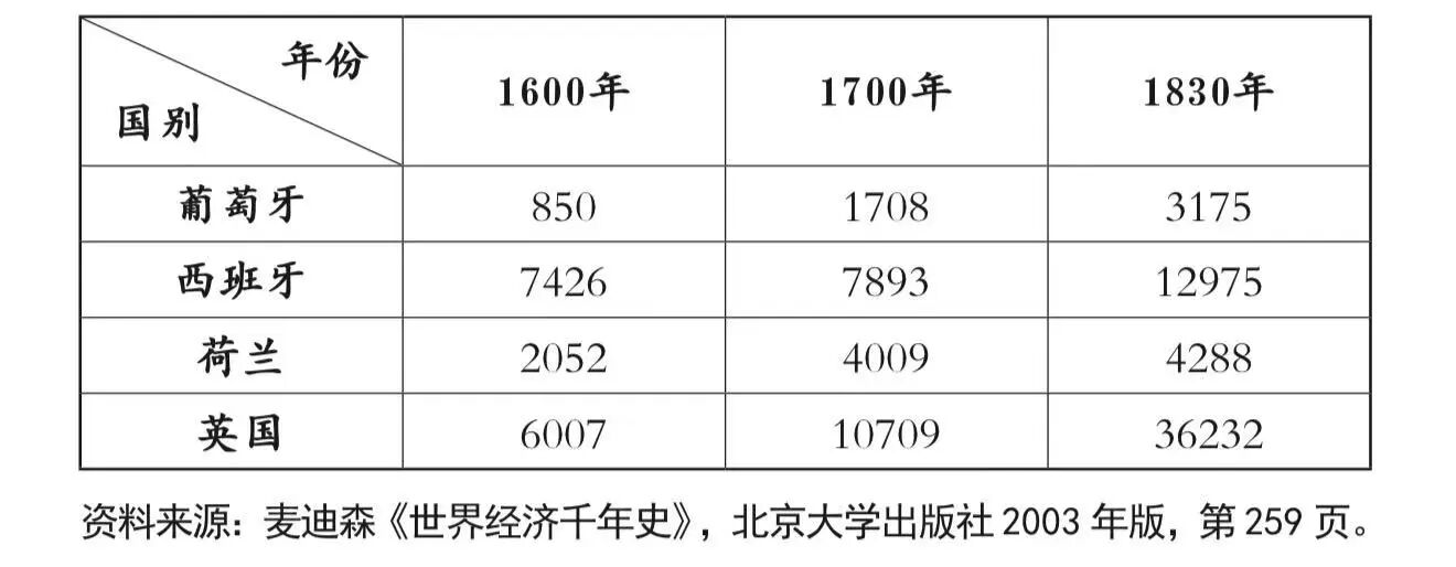 在19世纪中期以前很长的历史时期中,一个国家的综合国力主要取决于该国人口和经济规模的大小。葡、西、荷、英四国在人口和经济规模两方面的差别都很大,而且随着时间的变化有很大改变。具体情况见以下两表: